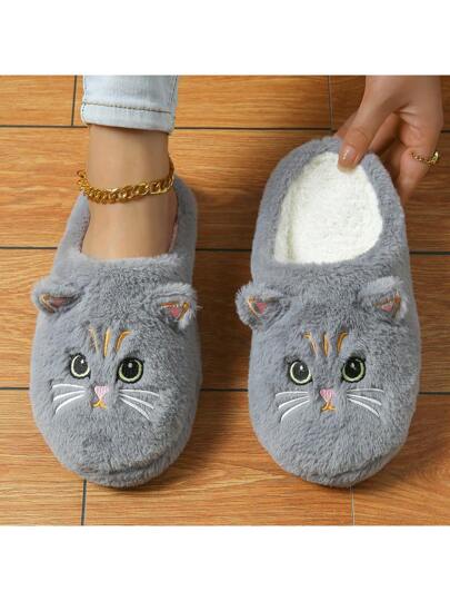 Cute Cartoon Big Eyes Cat Plush Earshaped Non-Slip Comfortable Home Slippers - Grey - View 1