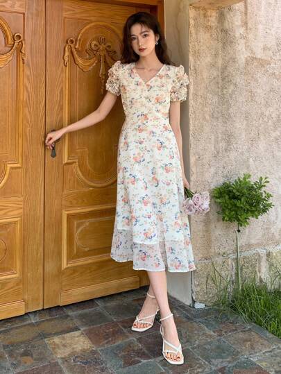 DAZY Floral Print Puff Sleeve Dress - Multicolor - View 1