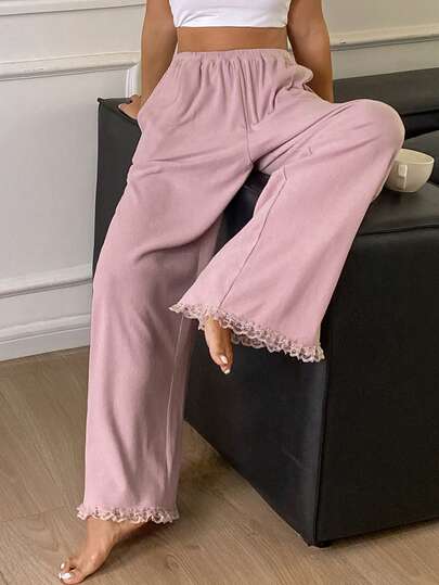 DAZY Ruffled Hem Patchwork Loose Long Women Cozy Pajama Bottoms - Dusty Purple - View 1