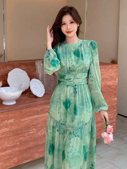 DAZY Women's Random Print Waist Cinched Long Sleeve Dress,Ruffle,Fall Dress - Green - View 1