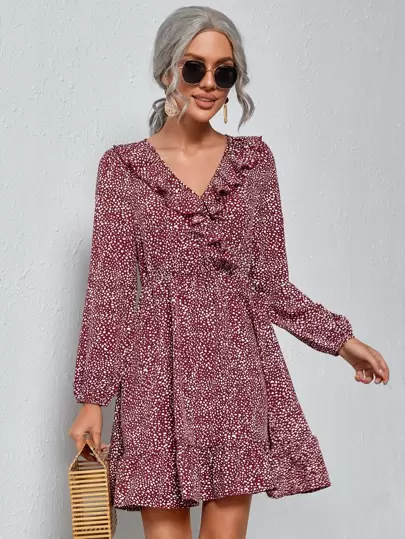 Dalmatian Print Ruffle Trim Dress - Burgundy - View 1