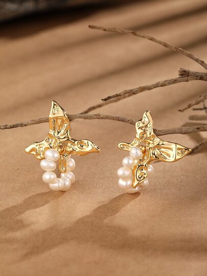 Faux Pearl Decor Butterfly Stud Earrings - Yellow Gold - View 1
