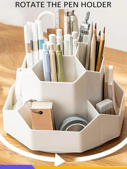 Desktop Stationery Organizer Pen Holder, Rotating Pencil Holder, Storage Box - Beige - View 1