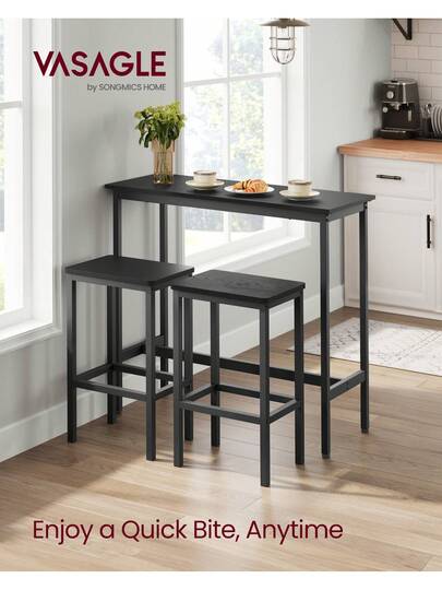 [Cheers, Bar Lovers] Whether you like a drink with friends or a light meal before you're on the go, this bar table and stools set is sure to delight. With ebony black and ink black tones, it rounds off your leisure or busy times with a pub-like vibe [Make a Breakfast Corner] The tall bar table with a size of 100 x 40 cm is spacious for holding your coffee, croissant, and juice; the two stools with a size of 40 x 30 cm each allow 2 people to comfortably enjoy breakfast-one corner is enough [Stable Versatile Table] The stretcher underneath the table, the anti-tip kit, and the 4 adjustable feet make the table safer and more stable; it can be used in the kitchen, living room, or bedroom for breakfast, wine, or work [Time for a Mojito] Worry about assembly? No need! This dining table set has a simple structure. With detailed instructions and numbered parts, you can successfully assemble it before you finish your mojito [What's in the Box] A set of 1 bar table and 2 stools, an instructions manual with an accessory bag, an anti-tip kit, and a good way to have complete relaxation in your own home Specifications: - Colour: Ebony Black, Ink Black - Material: Particleboard, Steel - Table Size: 39.4"L x 15.7"W x 35.4"H (100 x 40 x 90 cm) - Size of Each Stool: 15.7"L x 11.8"W x 25.6"H (40 x 30 x 65 cm) - Total Weight: 44.5 lb (20.2 kg) - Max. Static Load Capacity of Each Stool: 220 lb (100 kg) Package Contents: - 1 x Bar Table - 2 x Bar Stool - 1 x Accessory Kit - 1 x Anti-Tip Kit - 1 x Instructions Notes: - The max. static load capacity of each stool is 100 kg. Please do not exceed its weight limit. - Please attach the table to the wall with the included anti-tip kit for safety. - Do not lean back and forth while sitting on the stool to avoid falling over.