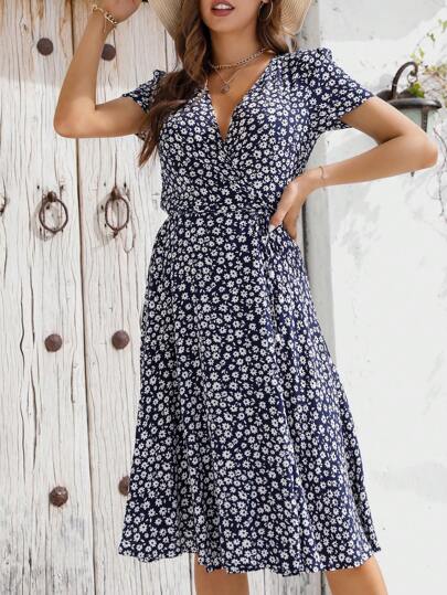 Ditsy Floral Print Knot Side Wrap Dress - Navy Blue - View 1