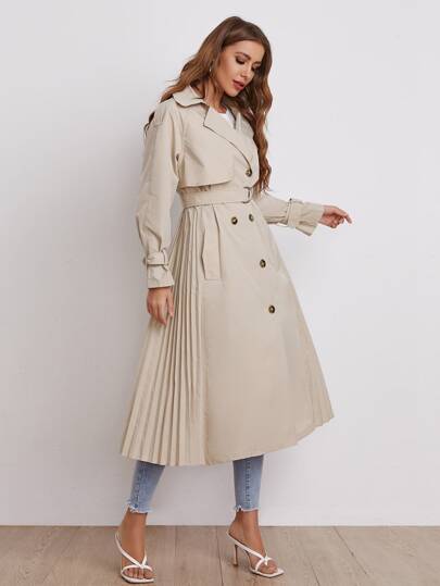 SHEIN Double Breasted Pleated Hem Trench Coat - Beige - View 1