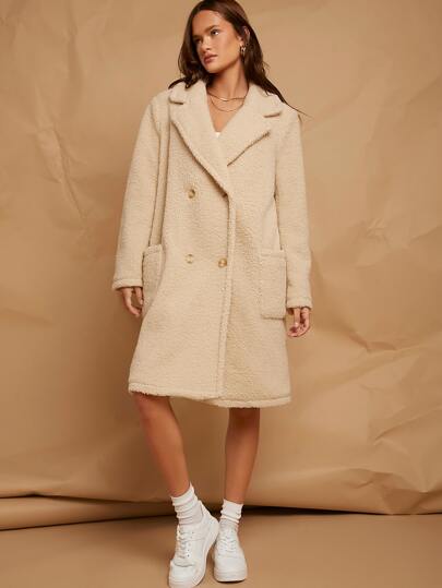 SHEIN Privé Double Breasted Teddy Coat - Beige - View 1
