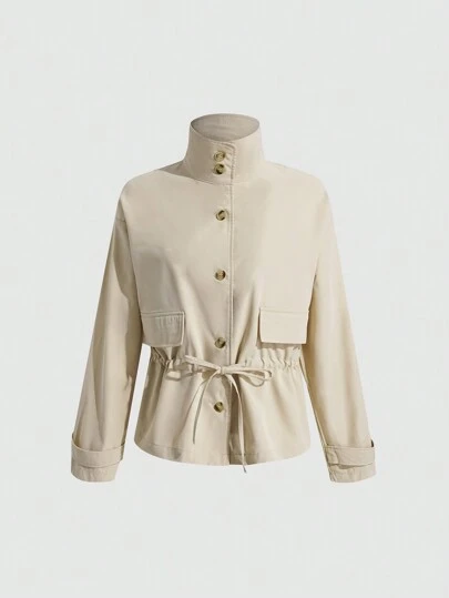 SHEIN Unity Drawstring Waist Flap Detail Trench Coat - Khaki - View 1
