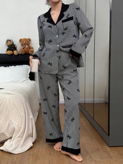 Dream Adore Women's Contrast Color Collar Ruffle Bow Striped Long Sleeve Pajama Set Feather Pajamas Leppard Print Western Pj Set - Black - View 1
