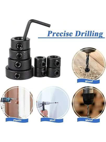 Drill Depth Stop Bit Collar Set Adjustable Positioner Limit Ring Allen Wrench Tighten Stopper Set-Screws Woodworking Tool - Black - View 1