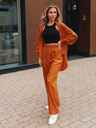 Drop Shoulder Solid Longline 1 Shirt & 1 Trousers Set - Ginger - View 1