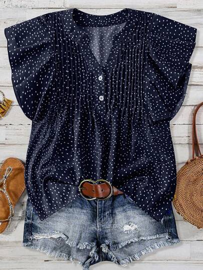 EMERY ROSE Casual V-Neck Partial Open Ruffle Sleeve Polka Dot Shirt - Multicolor - View 1