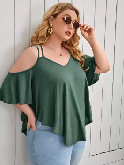 SHEIN LUNE Plus Cold Shoulder Crisscross Ruffle Trim Asymmetrical Hem Tee - Green - View 1