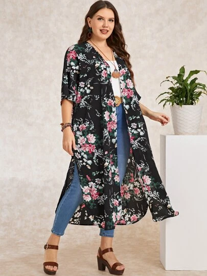 EMERY ROSE Plus Floral Print Split Hem Kimono - Multicolor - View 1