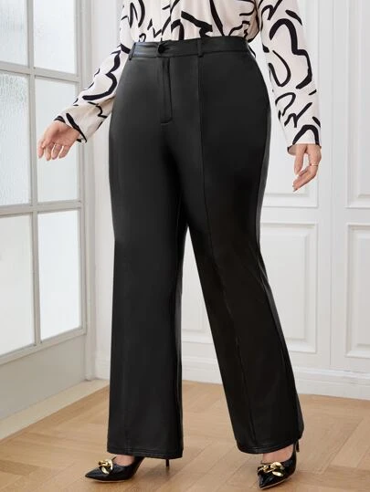 SHEIN Clasi Plus High Waist PU Leather Flare Leg Trousers - Black - View 1