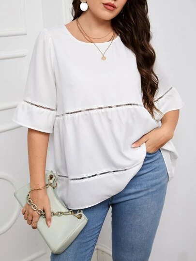 SHEIN LUNE Plus Hollow Out Flounce Sleeve Blouse - White - View 1