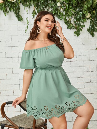 SHEIN Clasi Plus Off Shoulder Scallop Laser Cut Hem Dress - Mint Green - View 1