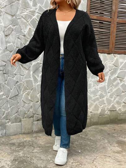 EMERY ROSE Plus Size Solid Color Long Sleeve Cardigan, Minimalist Long Open Front Sweater, Casual Everyday Wear - Black - View 1