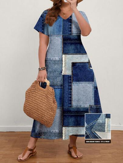 EMERY ROSE Plus Size Women's Casual Patchwork Pattern V-Neck Short Sleeve Dress, Suitable For Spring/Autumn, For Summer,Beach Dress Sundress,Holiday Outfits Boho Suitable For Going Out Chic Dress - Blue - View 1