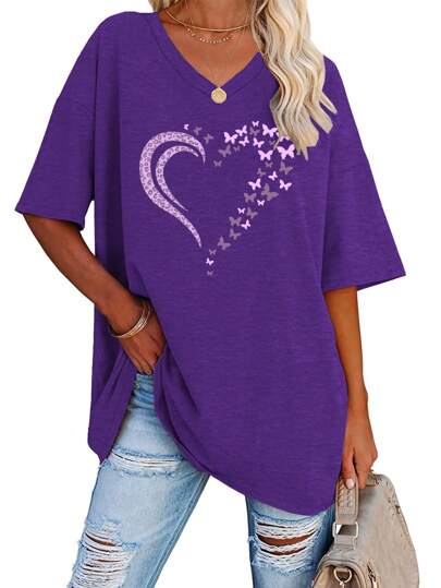 EMERY ROSE Popular Spring And Summer Women'S V-Neck Short-Sleeve Loose Heart T-Shirt Top From Europe And America. - Purple - View 1
