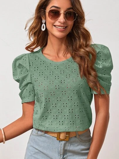 SHEIN Clasi Puff Sleeve Schiffy Tee - Mint Green - View 1