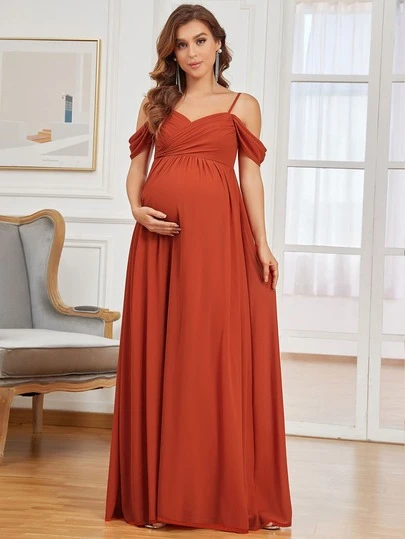 EVERPRETTY Maternity Cold Shoulder Chiffon Dress - Burnt Orange - View 1