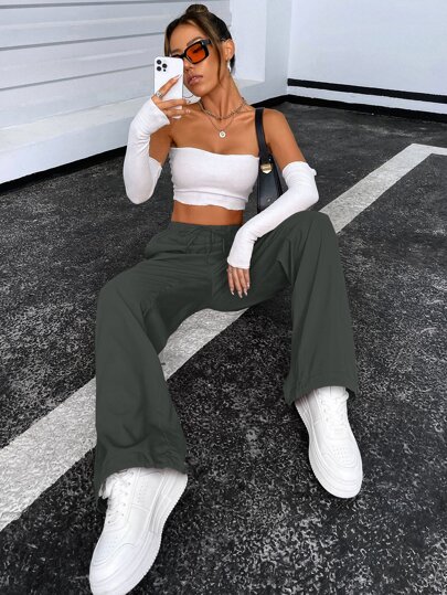SHEIN Unity Elastic Waist Wide Leg Trousers - Dark Grey - View 1