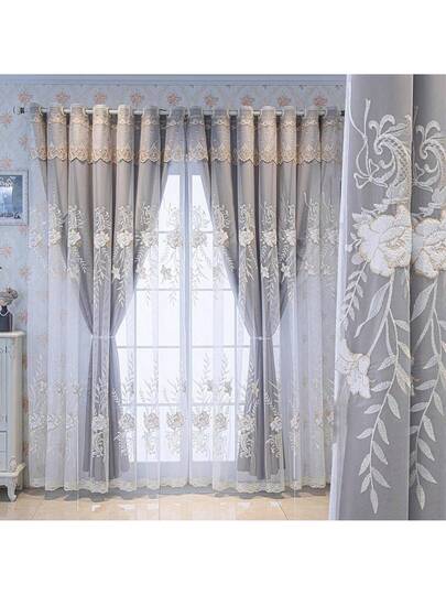 Embroidered Curtain, 1 Count Modern Simple Double Layer Curtain, Heat Insulation & Sun Protection Curtain, Home Decor For Living Room Bedroom - Gray - View 1