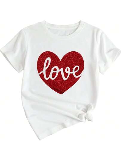 Girl's Letter Graphic Short Sleeve T Shirt Heart Print Crew Neck Tees Breathable Casual Tee Tops - White - View 1