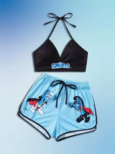 ROMWE X The Smurfs Letter Cartoon Graphic Halter Pajama Set, School - Multicolor - View 1