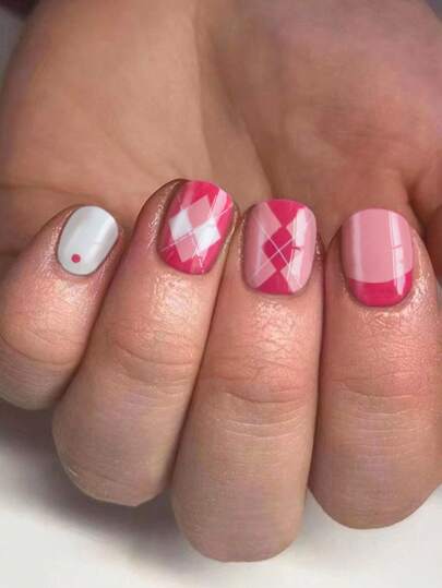 Enhance Your Look With 24Pcs Short Round French Line Checkered Nail Wear, Including 1Pc Jelly Gel And 1Pc Nail File For Daily Wear And Parties Press On Nails Nail Supplies Nails - Red and White - View 6