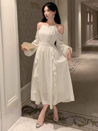 DAZY Women's Solid Color Ruffled Collar Hollow Out Elegant Long Sleeve Dress, Birthday ,New Year Eve Prom Dress,Fall Clothes,Back To School Clothes - White - View 1