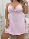 1pc Plus Size Women's Lace Trimmed Nightgown With Side Slits And Bow Decorated Straps, Christmas, Moo Moo Night Dress