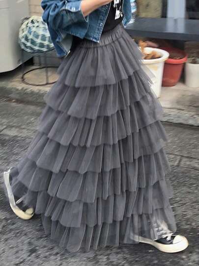 FRIFUL Women's Elastic Waist Layered Mesh Patchwork Cake Skirt, Suitable From Spring To Summer - Black - View 1