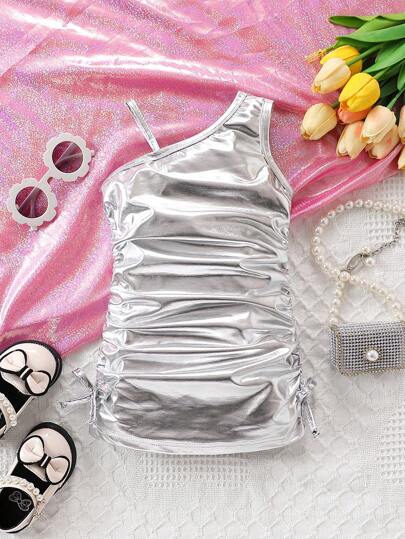Fashionable Baby Girl Silver Pleated Asymmetrical Dress For Summer - Silver - View 1