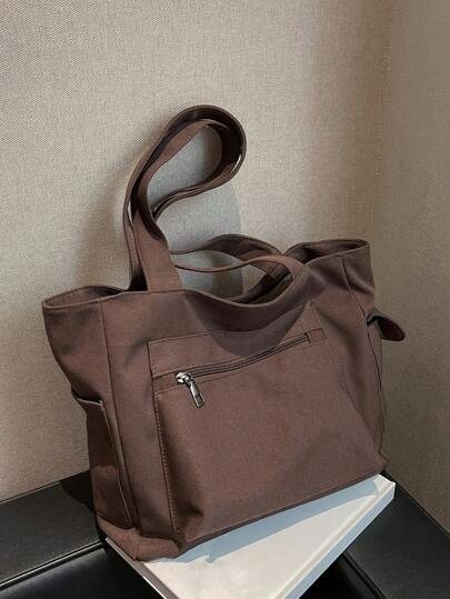 Fashionable & Simple Shoulder Bag Solid Color Large Capacity Commuter/Travel/Shopping Tote With Multiple Pockets - Brown - View 1