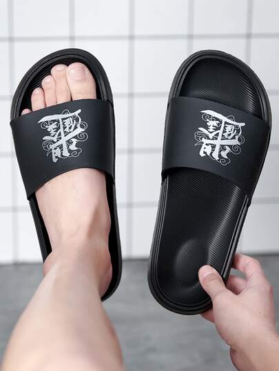 Fashionable Slides For Men, Two Tone Chinese Character Single Band PVC Slippers - Black - View 1