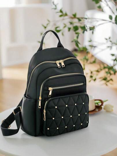 Fashionable Women's Large Capacity Rivet Design Backpack, Versatile Handheld/Shoulder Commuting Bag, Student/ Mommy Backpack, School Backpack - Black - View 1