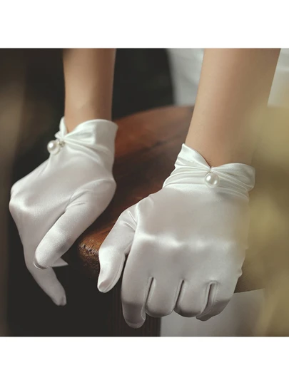 Faux Pearl Decor Bridal Gloves - White - View 1