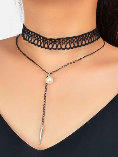 Faux Pearl Decor Layered Lace Choker - Black - View 1