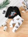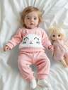 2pcs Baby Girls Cute Bow Print Chiffon Long Sleeve Top And Casual Pants Set, Fashionable And Sweet