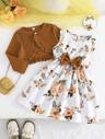 Children's Clothing Summer Set For Baby Girls, Featuring Cute Bowknot Cap Sleeve Top And Matching Flower Printed Shorts, 2pcs