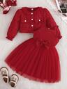 2pcs/Set Young Girl Fashion Jacket & Embroidered Mesh Slip Dress Formal Outfit, Spring & Fall