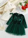 Christmas Girls Long Sleeve Bow Mesh Ruffle Hem Dress, Christmas Tree Print Cute 2 In 1 Holiday Party Dress