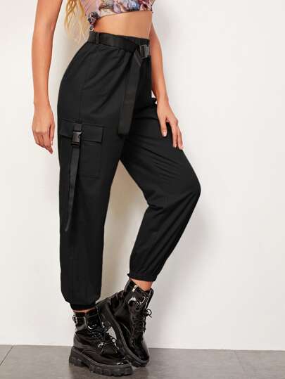SHEIN Flap Pocket Cargo Trousers With Push Buckle Belt - Black - View 1