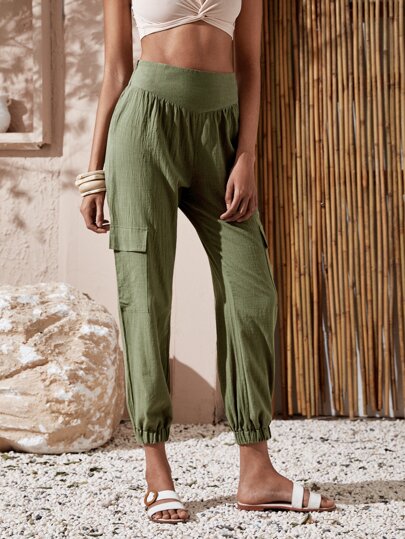 Flap Pocket Crop Cargo Trousers - Army Green - View 5