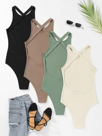 SHEIN Unity 4pcs Rib Knit Criss Cross Bodysuit - Multicolor - View 1