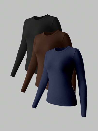 SHEIN Unity Solid Color Round Neck Fitted Casual Versatile Long Sleeve T-Shirt Fall Cloth For Women - Multicolor - View 3