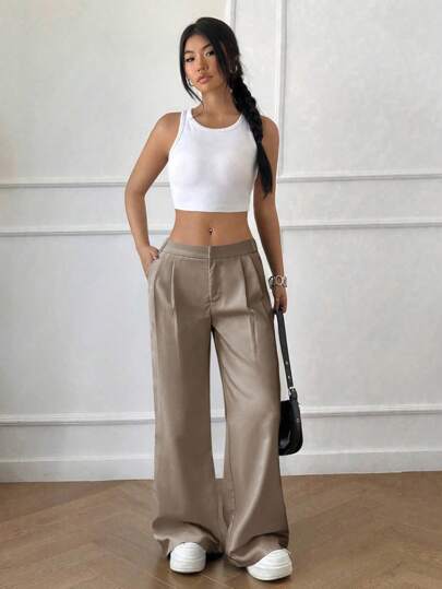 SHEIN LUNE Women's Ultra Low Rise Slimming Simple Style Trousers - Camel - View 1