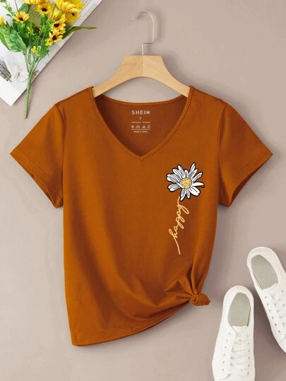 INAWLY Floral And Letter Graphic Tee - Brown - View 1
